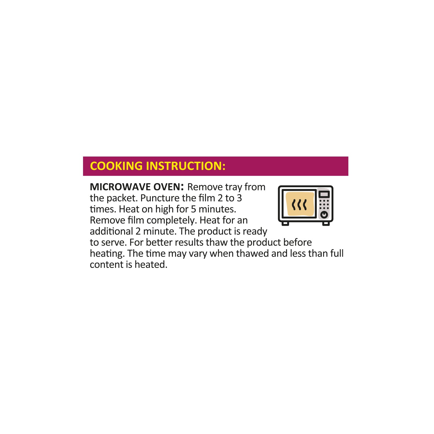 MICROWAVE OVEN: Remove tray from the packet. Puncture the film 2 to 3 times. Heat on high for 5 minutes. Remove film completely. Heat for an additional 2 minute. The product is ready to serve. For better results thaw the product before heating. The time may vary when thawed and less than full content is heated.
