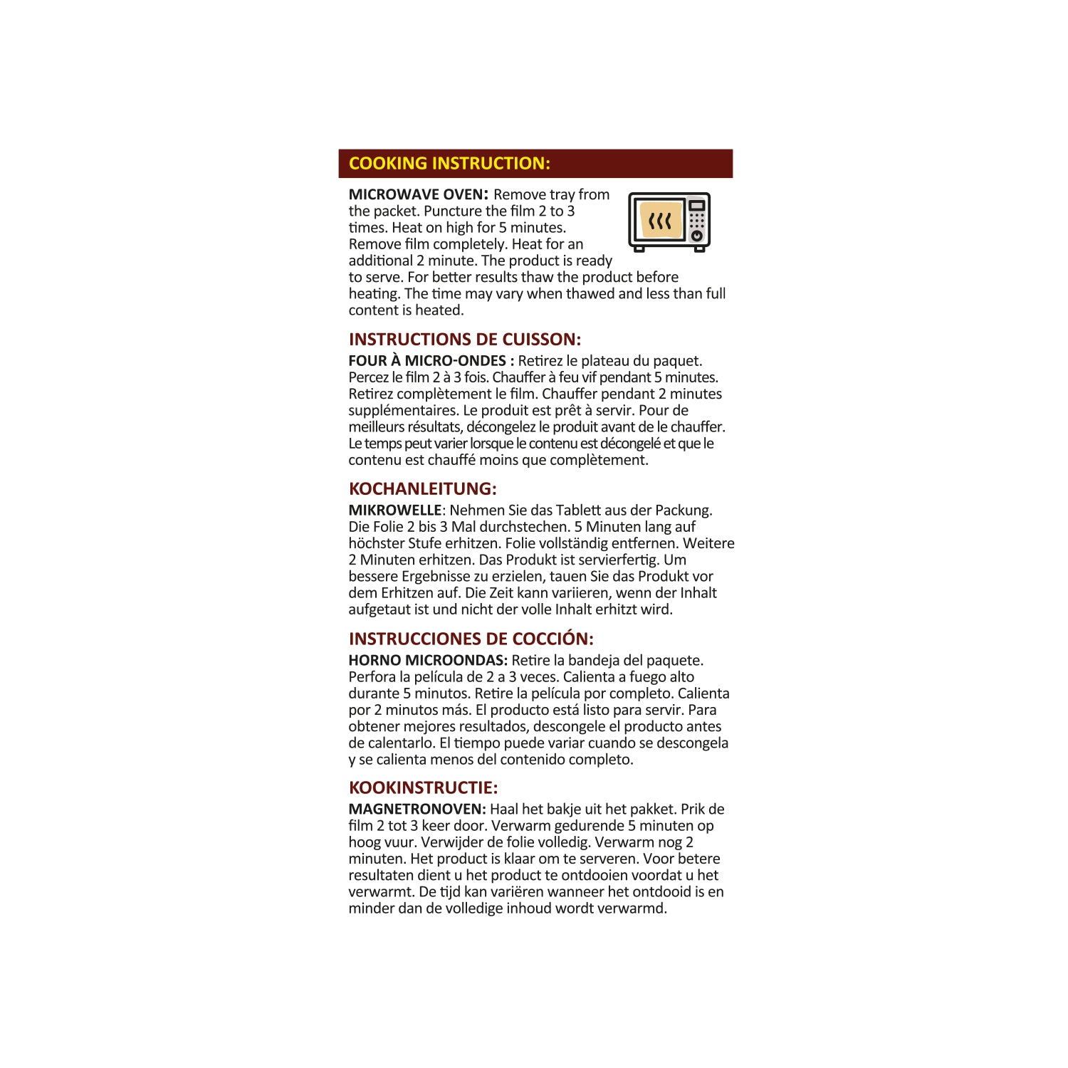 MICROWAVE OVEN: Remove tray from the packet. Puncture the film 2 to 3 times. Heat on high for 5 minutes. Remove film completely. Heat for an additional 2 minute. The product is ready to serve. For better results thaw the product before heating. The time may vary when thawed and less than full content is heated.